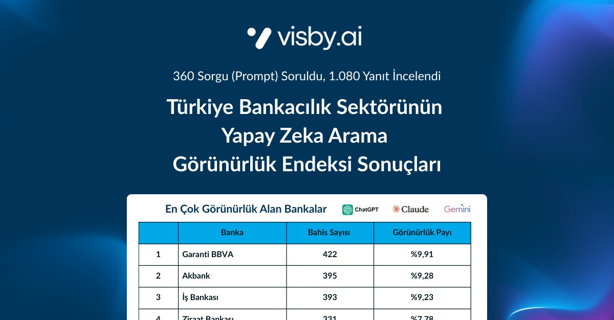 Visby, ‘Türkiye Bankacılık Sektörü Yapay Zeka Arama Görünürlük Endeksi’ isimli, Türkiye’deki bankaların LLM’lerdeki (ChatGPT, Gemini, Claude) görünürlüğünü analiz ettiği raporunu bugün yayınladı.